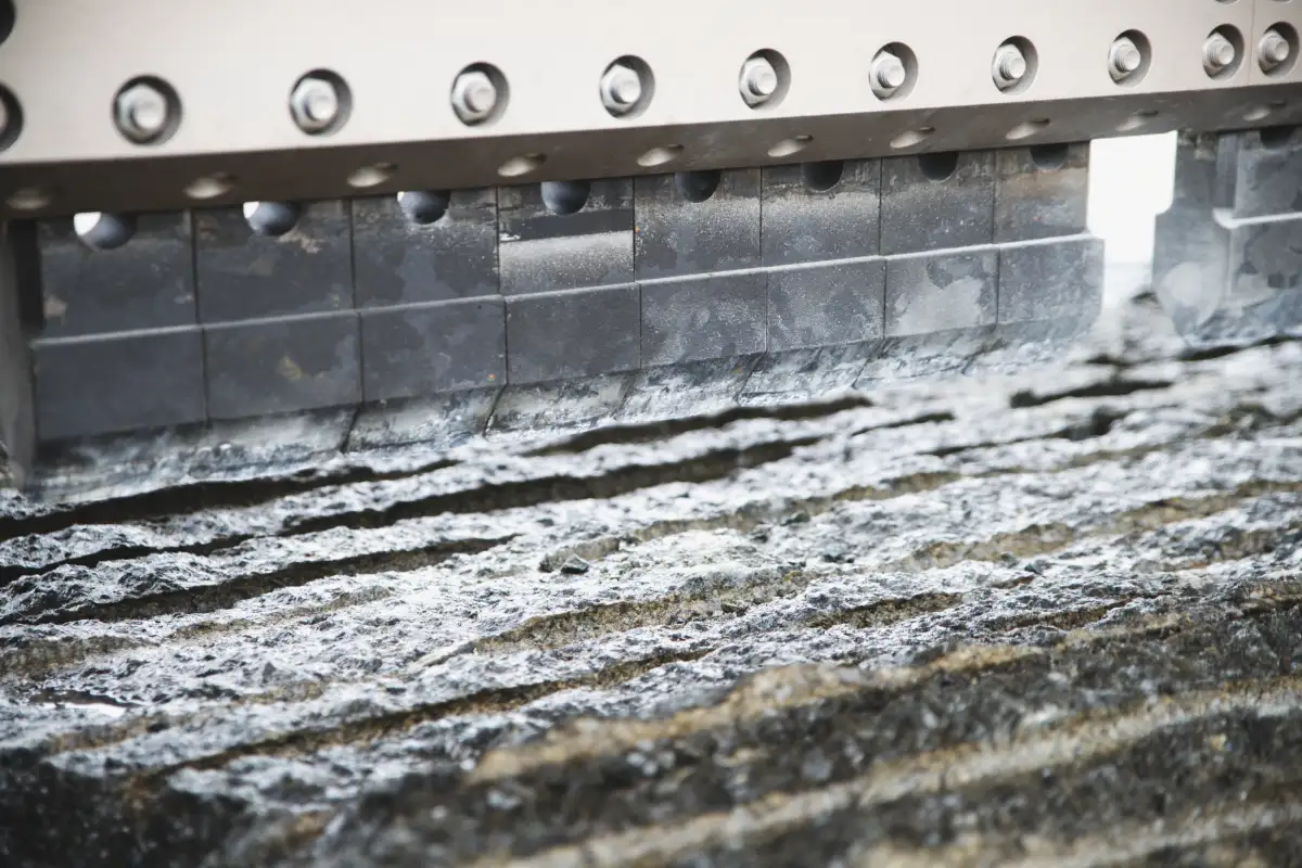When splitting large blocks, small waste falls down the machine and conveyors into a channel where it is continuously removed. This minimizes unproductive cleaning time and prevents potential damage to the machine from accumulated waste.